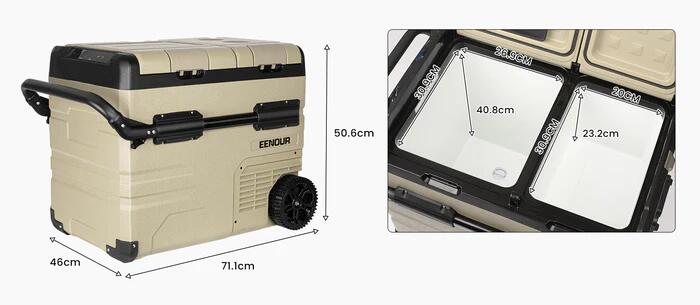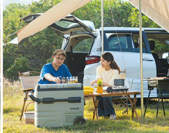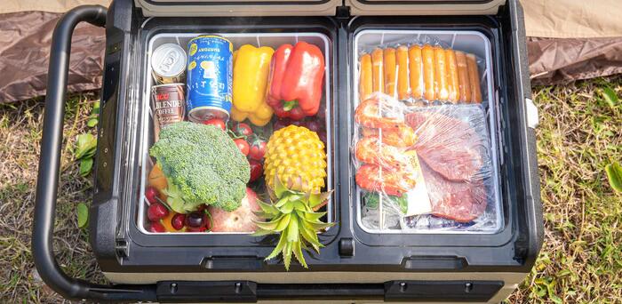 従来の車載冷蔵庫と異なり、左右部屋の温度は別々に設定できるため、片方でアイスクリームや冷凍食品を凍りながら、もう片方で飲み物や果物を冷やすことが可能です。それに、-20℃~20℃まで1℃単位で調節可能なので、食材を最適な温度で保存できます。容量も45Lと大きいので、食材と飲み物がたっぷり収納可能、大人数のBBQや連泊のキャンプに大変重宝します。